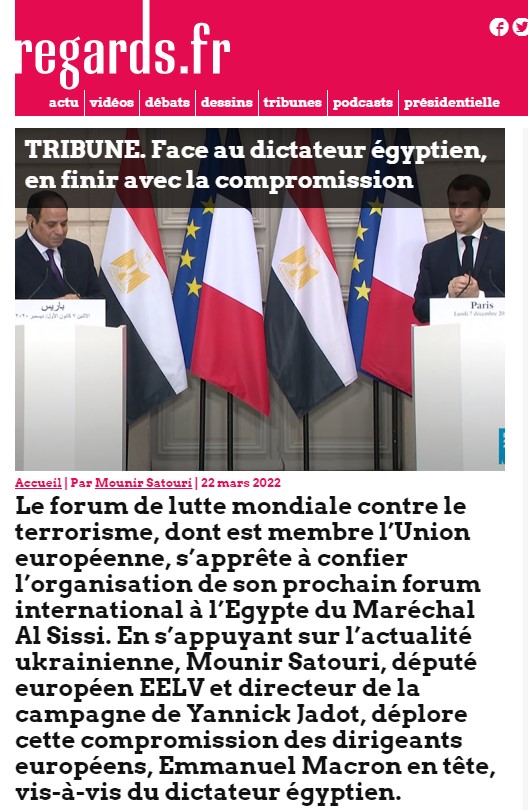 En début d’année, un document confidentiel fuitait du Service d’action extérieure de l’Union européenne, confirmant que les États membres de l’Union européenne donnaient leur accord pour que l’UE dépose une candidature conjointe avec l’Égypte pour co-présider le Forum mondial de lutte contre le terrorisme. Au vu de l’utilisation par l’Égypte de la lutte contre le terrorisme comme excuse pour une répression des opposant-e-s démocratiques, défenseurs-ses des droits, journalistes, chercheurs-ses, étudiant-e-s, les ONGs de défense des droits humains comme Human Rights Watch dénnonçaient cette initiative. Devant l’absence de remise en question de cette décision de la part des parties prenantes européennes, Mounir Satouri, rapporteur permanent du Parlement européen sur l’Égypte, refuse le silence face à cette dérive qui trahit les positions du Parlement européen.