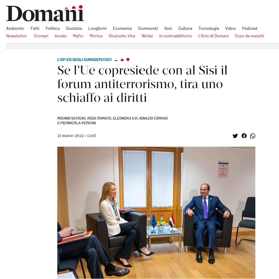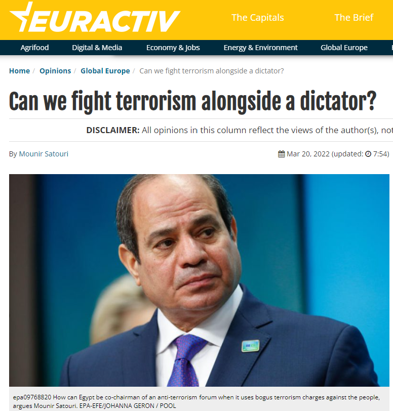 En début d’année, un document confidentiel fuitait du Service d’action extérieure de l’Union européenne, confirmant que les États membres de l’Union européenne donnaient leur accord pour que l’UE dépose une candidature conjointe avec l’Égypte pour co-présider le Forum mondial de lutte contre le terrorisme. Au vu de l’utilisation par l’Égypte de la lutte contre le terrorisme comme excuse pour une répression des opposant-e-s démocratiques, défenseurs-ses des droits, journalistes, chercheurs-ses, étudiant-e-s, les ONGs de défense des droits humains comme Human Rights Watch dénnonçaient cette initiative. Devant l’absence de remise en question de cette décision de la part des parties prenantes européennes, Mounir Satouri, rapporteur permanent du Parlement européen sur l’Égypte, refuse le silence face à cette dérive qui trahit les positions du Parlement européen.