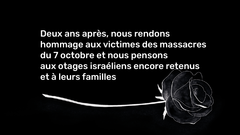 Deux ans après, nous rendons hommage aux victimes des massacres du 7 octobre et nous pensons aux otages israéliens encore retenus et à leurs familles.