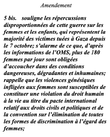 - Dans l’amendement 27 étaient déplorées les répercussions disproportionnées de la guerre à Gaza sur les femmes et enfants, et les violences sexuelles et sexistes à l’encontre des femmes, notamment forcées d’accoucher dans des conditions inhumaines, étaient condamnées.